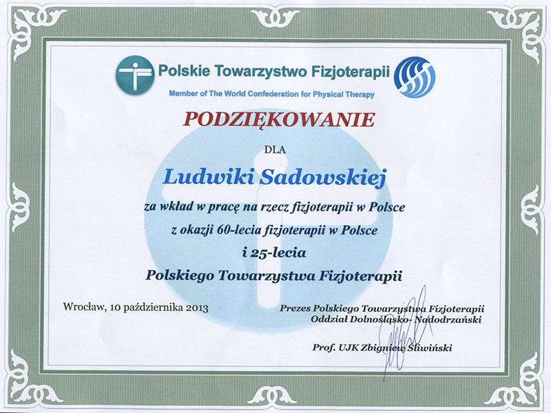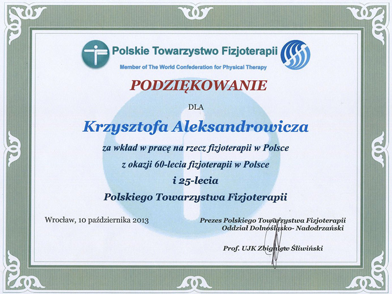 Pracownicy Katedry Fizjoterapii Uniwersytetu Medycznego im. Piastów Śląskich we Wrocławiu otrzymali podziękowania za wkład pracy włożonej w rozwój fizjoterapii w Polsce. Prof. dr hab. n. med. Ludwika Sadowska oraz dr n. med. Krzysztof Aleksandrowicz otrzymali okolicznościowe dyplomy.