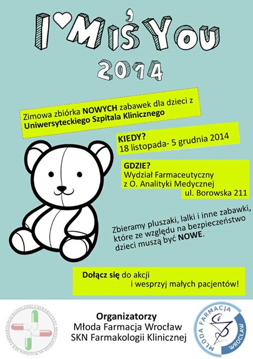 Młoda Farmacja Wrocław oraz SKN Farmakologii Klinicznej zapraszają do wzięcia udziału w akcji „I MiśYou 2014”. Mamy WYJĄTKOWY powód do działania: zbieramy zabawki dla małych pacjentów Oddziału Onkologii i Hematologii Dziecięcej Uniwersyteckiego Szpitala Klinicznego!