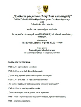 W dniu 10.grudnia 2025 r. odbyło się w Dolnośląskiej Izbie Lekarskiej spotkanie pacjentów chorujących na akromegalię. Przybyło ponad 20 pacjentów z rodzinami. Po prezentacjach przedstawionych przez pracowników Kliniki miała miejsce długa dyskusja i spotkanie towarzyskie.