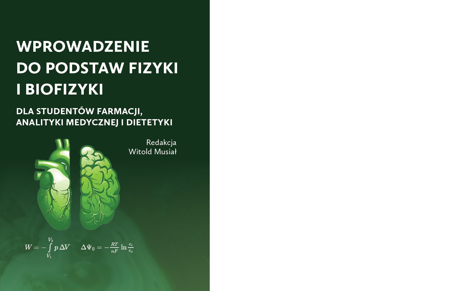 Wprowadzenie do podstaw fizyki i biofizyki dla studentów farmacji, analityki medycznej i dietetyki. Praca zbiorowa pod red. Witolda Musiała; aut. Berkowski R., Dryś A., Gasztych M., Gola A., Golonka I., Kobryń J., Kostrzębska A., Musiał W., Szczygieł M. J. Twarda M., Urbaniak T., Wójcik-Pastuszka D., Zapolski R.: Wrocław, Uniwersytet Medyczny im. Piastów Śląskich, 2025 (wkrótce dostępny)